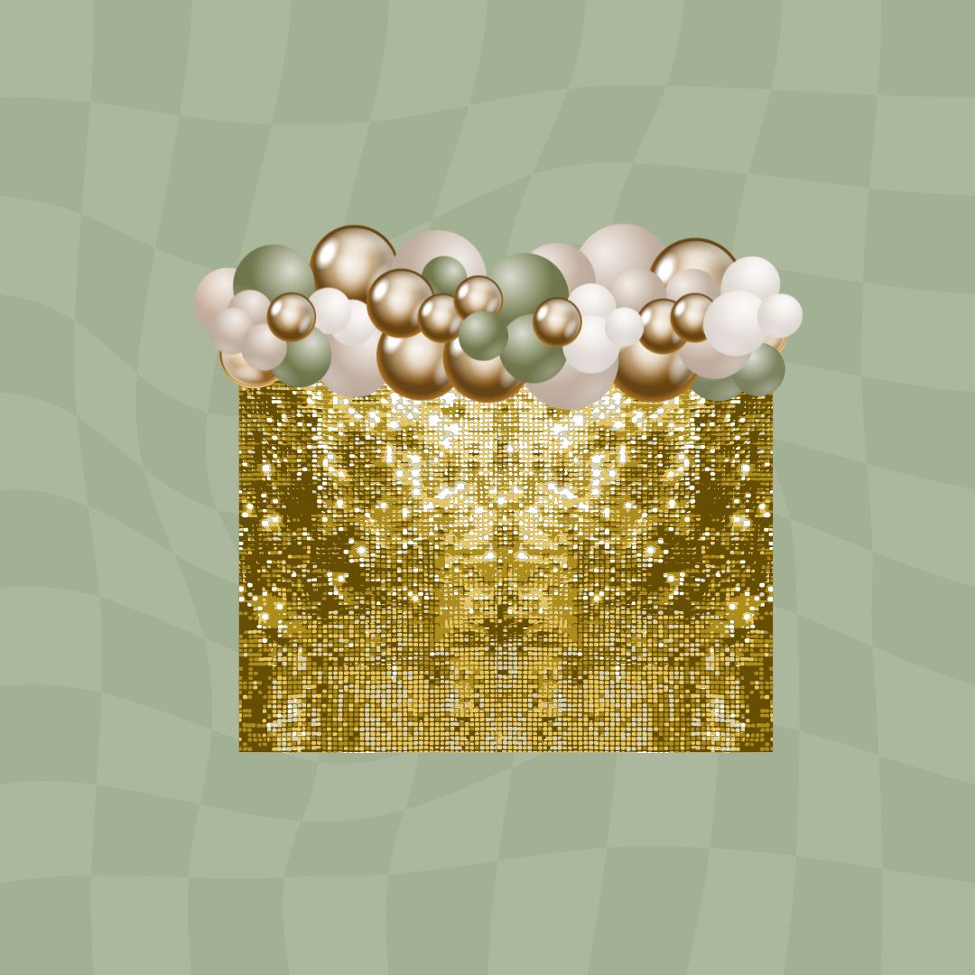 8ft by 8ft shimmer wall rental with stand included. 8ft of balloons can be attached to top. Foil balloons and any additional add-ons can be included for an extra cost.