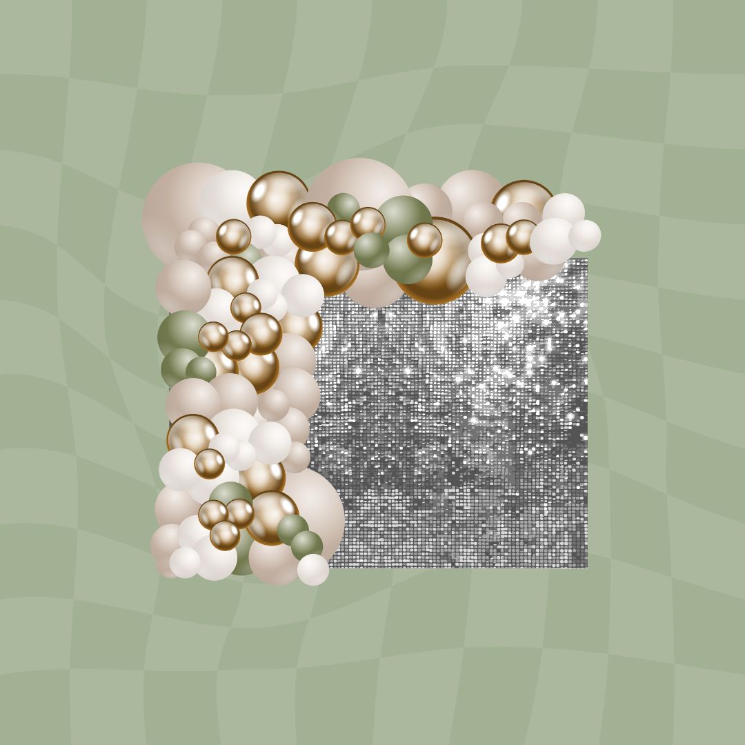 8ft by 8ft shimmer wall rental with stand included. L-Shaped balloons can be attached to top. Foil balloons and any additional add-ons can be included for an extra cost.